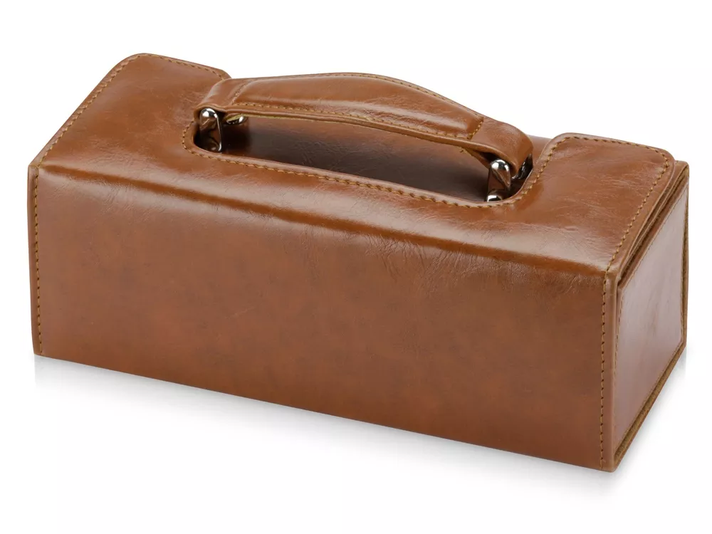 Настоящий сундучок из коричневого кожзама содержит целую кладезь полезных аксессуаров для чистки обуви. Набор не занимает много места при хранении и всегда готов прийти на помощь в поддержании чистоты вашей обуви. В набор входит 8 предметов. На футляр можно нанести логотип.