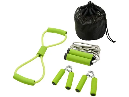 Набор для фитнеса Dwayne содержит весь спортивный инвентарь, необходимый для полноценной тренировки. Два кистевых эспандера, скакалка и грудной эспандер в соответствующем цветовом исполнении. Для удобной переноски поставляется в сетчатом мешочке, на котором можно сделать нанесение. Полиэстер.