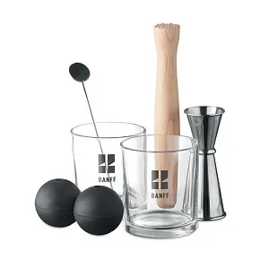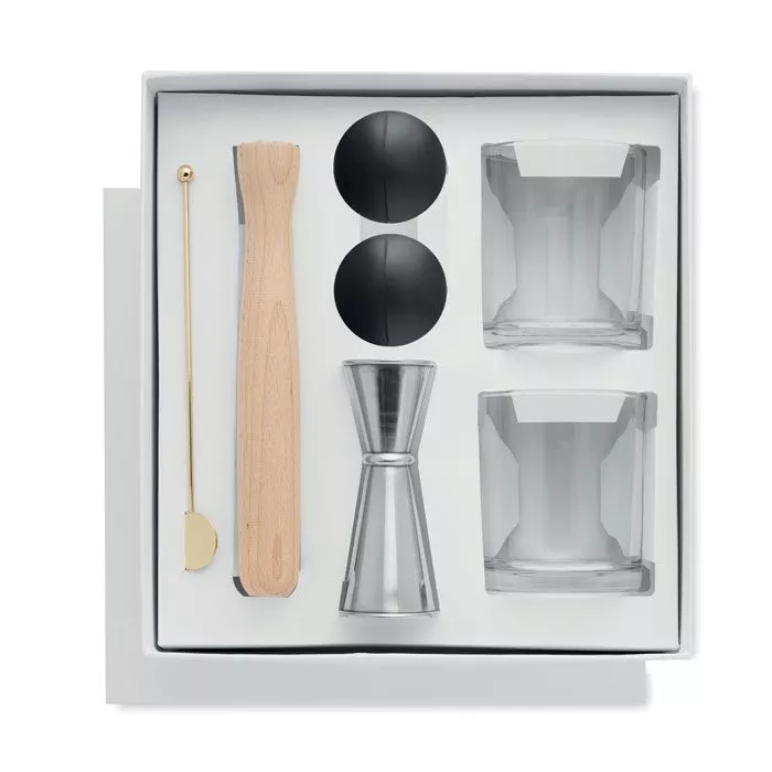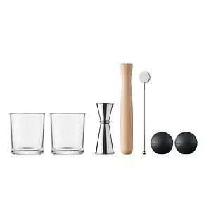 Набор бокалов для коктейля. Включает 7 предметов: два стакана, двусторонний мерный стаканчик из нержавеющей стали (25 и 50 мл), деревянная толкушка, размешиватель для напитков из нержавеющей стали и две силиконовые формы для льда в виде сферы.
