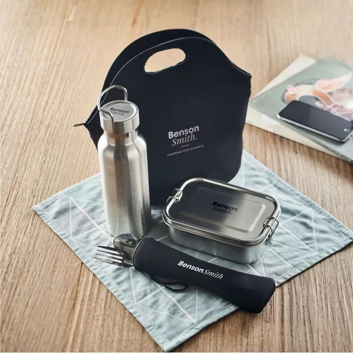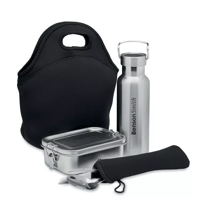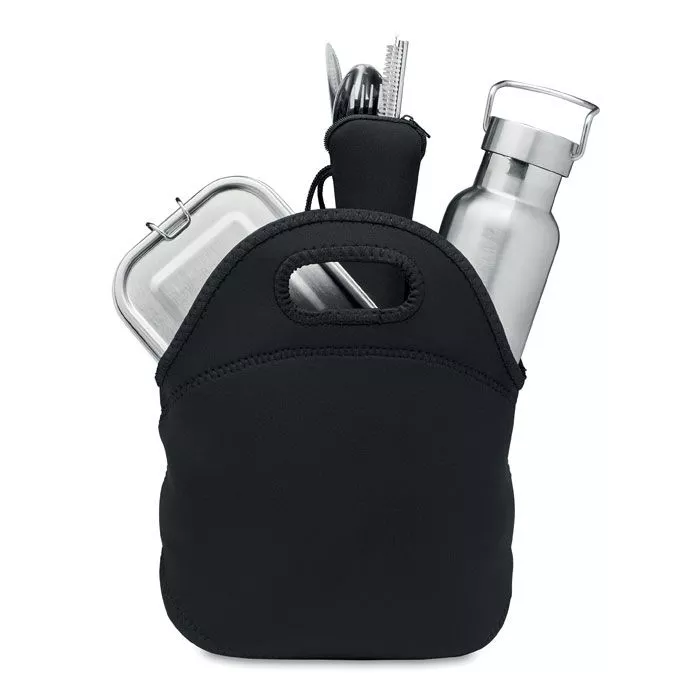 Набор для ланча в неопреновой сумке. Включает вакуумную бутылку из нержавеющей стали с двойными стенками (500 мл), ланчбокс (600 мл) и столовые приборы в неопреновом мешочке на молнии.