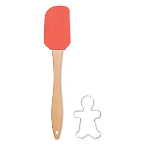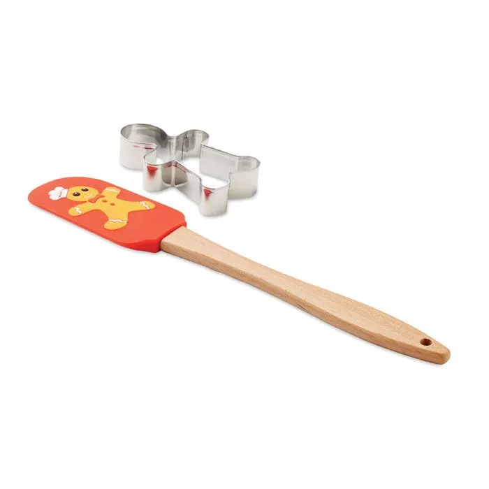 Набор для приготовления рождественского печенья. Включает силиконовую лопаточку с рисунком человечка с деревянной ручкой и нож для печенья из нержавеющей стали.