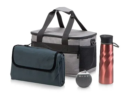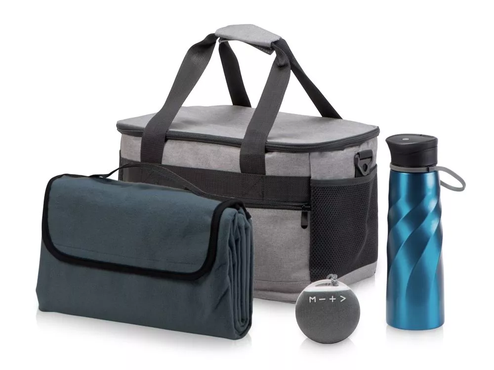 Всё, что нужно для пикника! Надежная и стильная портативная колонка имеет стильный дизайн, контрастный цвет кнопок и задней крышки, а также удобное крепление для переноски. Колонка обтянута акустической тканью для лучшего звучания, и проигрывает музыку со стандартной USB флешки или micro SD карты. Верхняя часть пледа изготовлена из мягкого и практичного флиса, подкладка из непромокаемого материала обеспечивает дополнительный комфорт. Удобная ручка и крепление на липучке помогает комфортно переносить плед в сложенном виде. Вместительная сумка-холодильник имеет основное отделение и карман спереди на молнии. Специальная конструкция дна предотвращает протекание жидкости от размораживания. Съемный плечевой ремень регулируется по длине. В комплекте открывалка для бутылок. Бутылка для воды сочетает в себе превосходную функциональность и внешний вид. Высококачественная сталь 18/8 и одностенная конструкция делает бутылку не только прочной, но и лёгкой. Крышка сконструирована таким образом, чтобы ее можно полностью разобрать для удобной чистки. - колонка позволяет принимать звонки и имеет режим радио; - сумка с 2 дополнительными сетчатыми карманами; - объем бутылки 1000 мл.