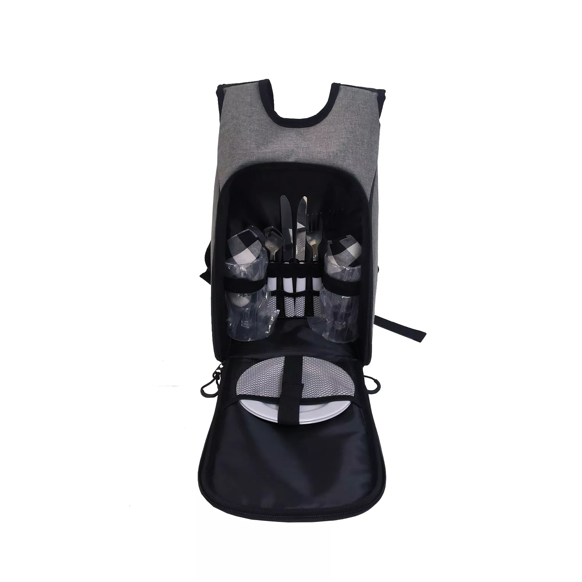 В набор входит: *Сумка 23 х 33 х 12 см *Вилки, ложки и ножи из нержавеющей стали по 2 шт. *Тарелки d 15 х 0,9 см - 2 шт. *Бокалы из поликарбоната h 13,2 х d 6,4 см, объем 200 мл - 2 шт. *Салфетки из хлопка 30 х 30 см - 2 шт.