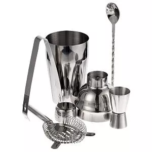 Отмерить нужное количество ингредиентов для напитка поможет мерный стаканчик — джиггер, барной ложкой удобно насыпать специи, а обратной ее стороной — разминать сочные кусочки фруктов. Щипцы пригодятся для добавления в шейкер кусочков льда или сахара, а ситечко-стрейнер поможет отделить коктейль от льда и мякоти фруктов, когда понадобится перелить уже готовый напиток из шейкера в стакан.В наборе: