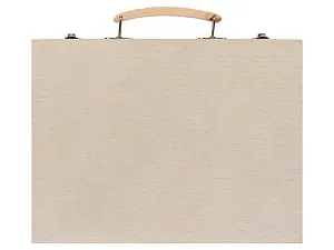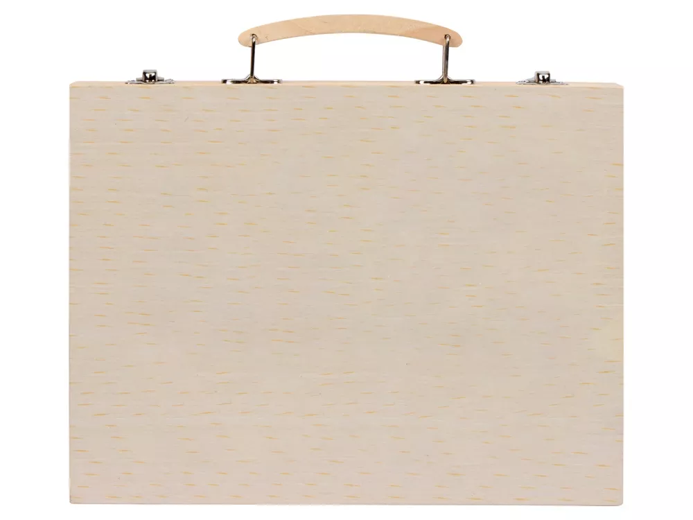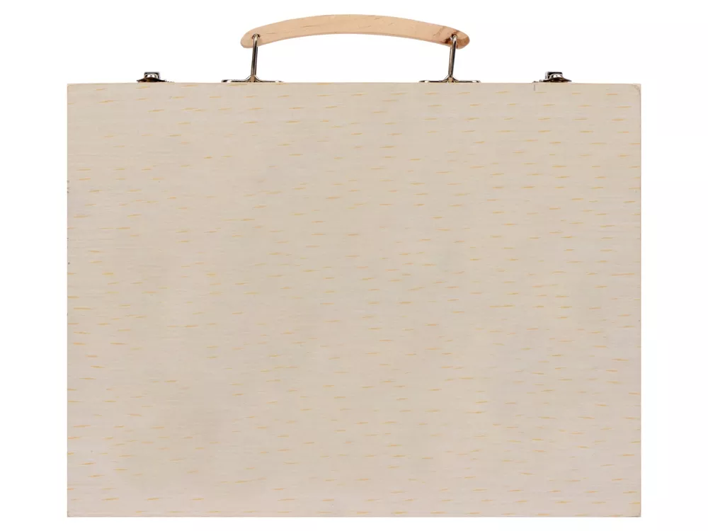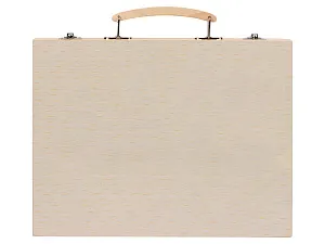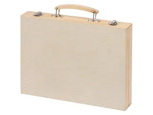 Набор из 67 предметов для рисования. Набор включает 12 акварельных красок, 12 цветных карандашей, 12 масляных пастелей, 12 фломастеров, 12 мелков, клей, резинку, точилку, карандаш HB, линейку и кисточку. Набор упакован в деревянный чемоданчик.
