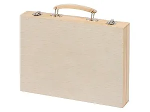 Набор из 67 предметов для рисования. Набор включает 12 акварельных красок, 12 цветных карандашей, 12 масляных пастелей, 12 фломастеров, 12 мелков, клей, резинку, точилку, карандаш HB, линейку и кисточку. Набор упакован в деревянный чемоданчик.