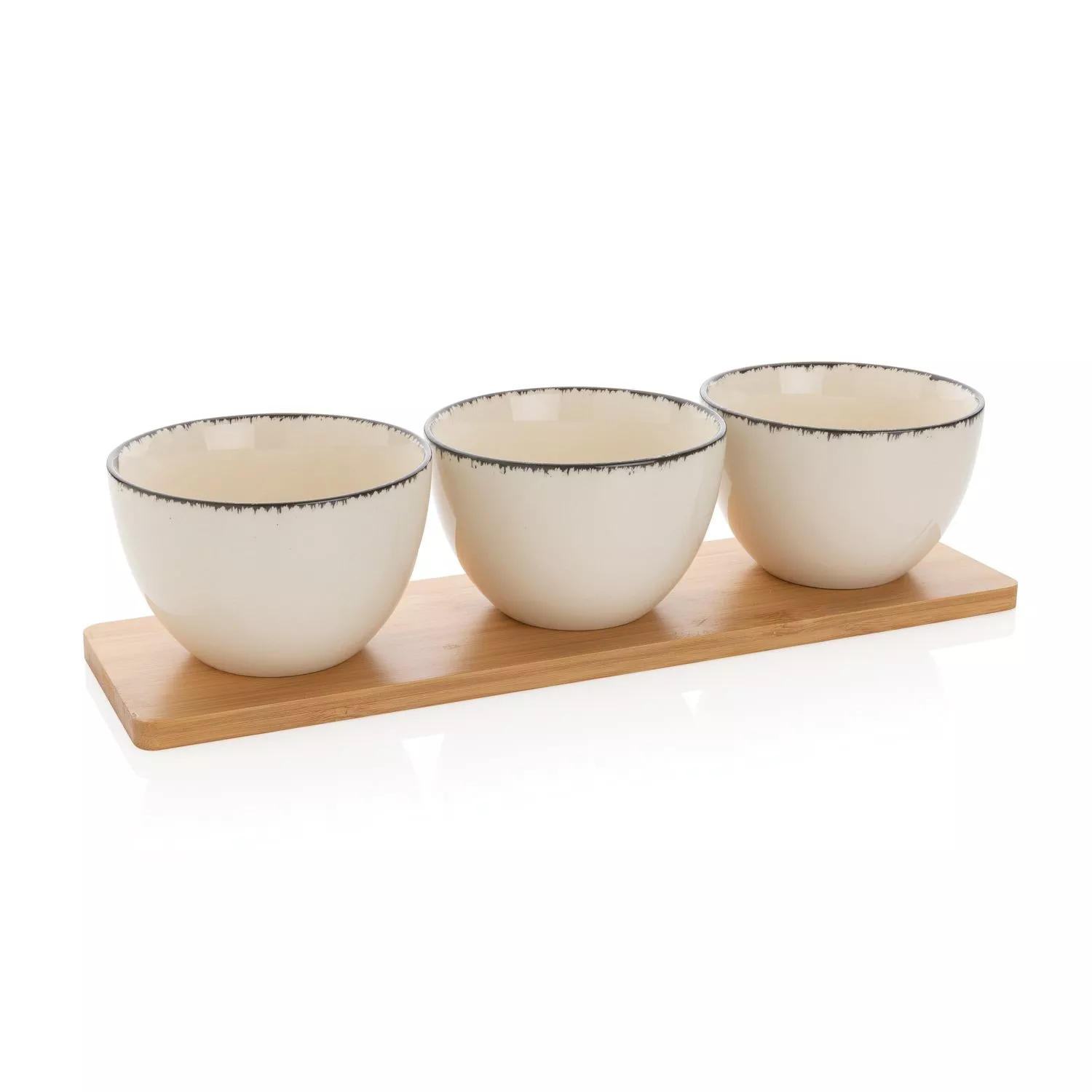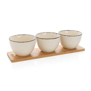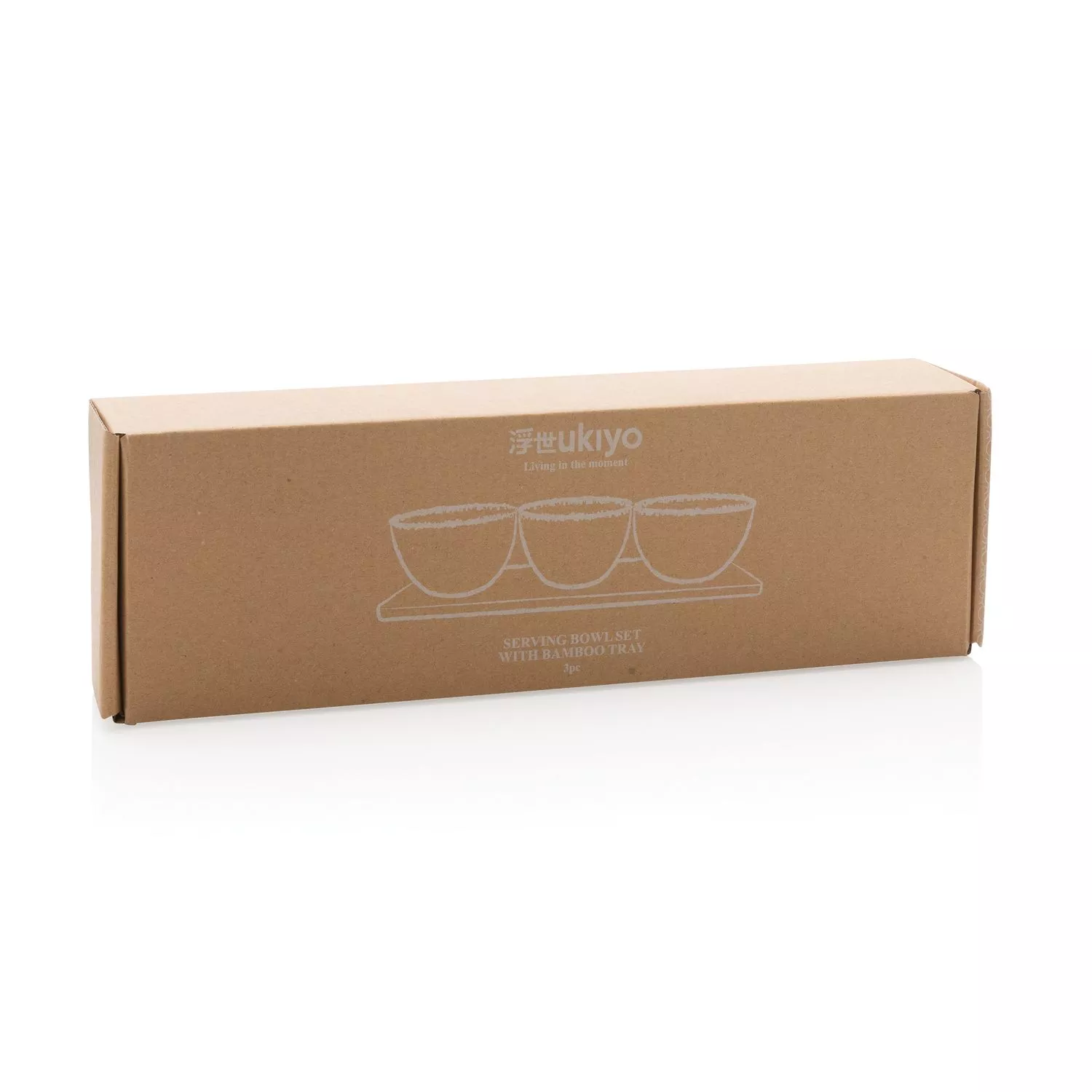 Маленькие детали имеют большое значение, когда дело касается сервировки! Набор Ukiyo из 3 небольших мисок с бамбуковым подносом добавит вашему столу особой изысканности. Керамические тарелочки идеально подойдут для подачи закусок или соусов. Поднос из натурального бамбука можно использовать как вместе с ними, так и отдельно. Диаметр керамической миски 13 см, высота изделия 8 см. Набор поставляется в крафтовой коробке.