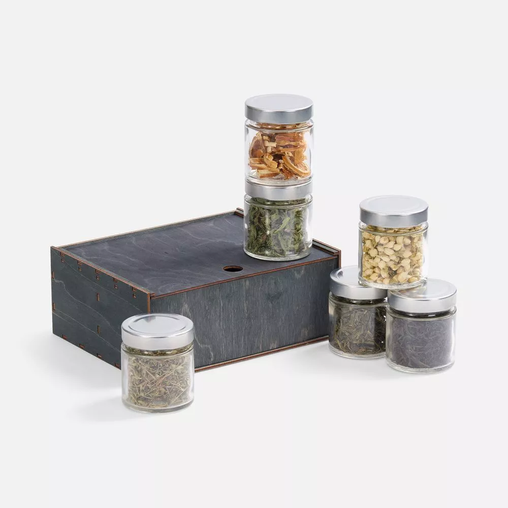 Бутоны жасмина наполняют напиток тонким цветочным ароматом, сушеная мелисса вносит легкую цитрусовую свежесть, чабрец придает пряную нотку, а дольки апельсина — яркую фруктовую кислинку. Смешивая эти ингредиенты на свой вкус, можно стать настоящим чайным мастером, — и каждый раз будет получаться уникальное сочетание, которое отразит текущие предпочтения и настроение. Деревянная коробка‑пенал придает подарку благородный и экологичный вид.