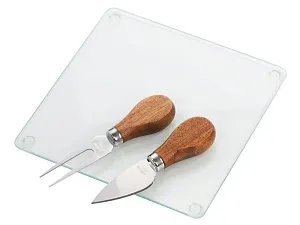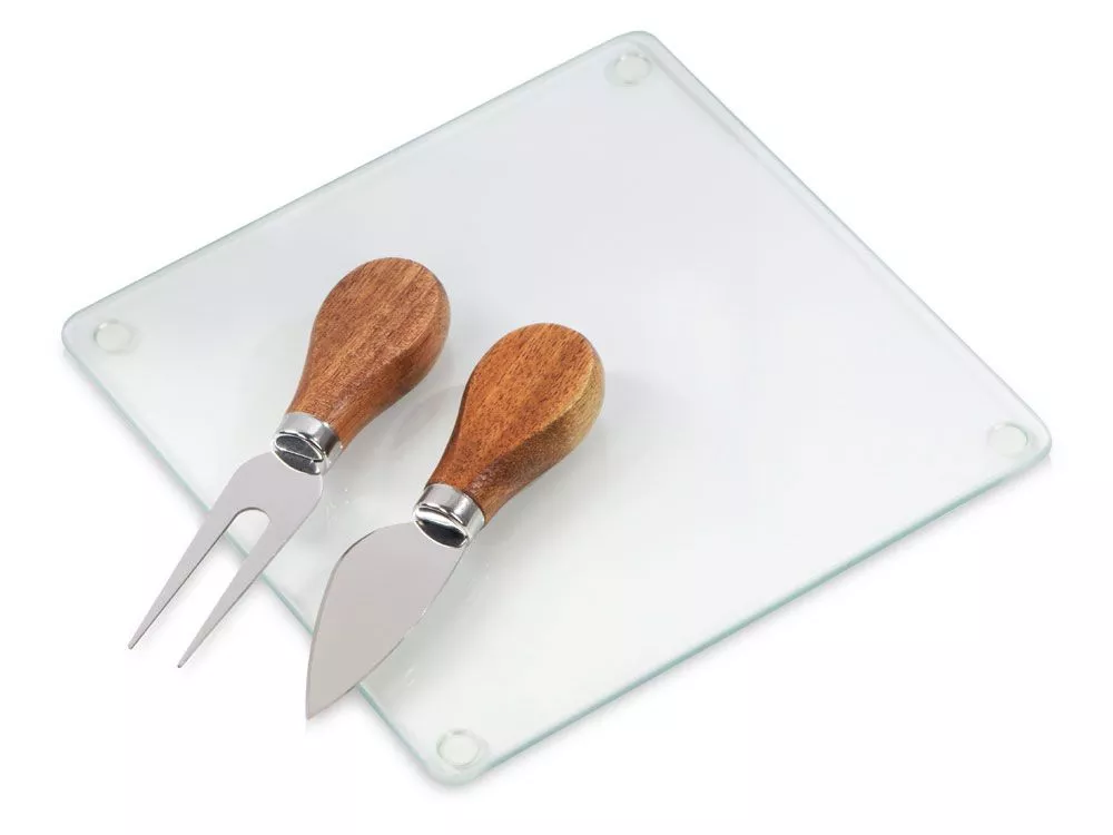 Набор для подачи закусок состоит из доски, вилки и ножа. Все части сета можно брендировать: и ручки приборов, и стеклянную доску, брендируемую методом полноцветной УФ-печати. Ручки вилки и ножа для сыра выполнены из акации — дерева, которое идеально подходит для подобных изделий. Акация благородно выглядит, красиво смотрится с гравировкой и не боится влаги. - возможность полноцветного нанесения на доску - ручки приборов с полем для гравировки - набор прекрасно подходит для подготовки и сервировки закусок, сыра, колбасных нарезок - стеклянную доску легко мыть - доска выполнена из закаленного стекла - на такой можно разделывать продукты Гравировка (оптоволоконный лазер) (Без чернения) на данный товар осуществляется бесплатно. Оплачивается только настройка оборудования в размере 950 рублей на весь тираж.