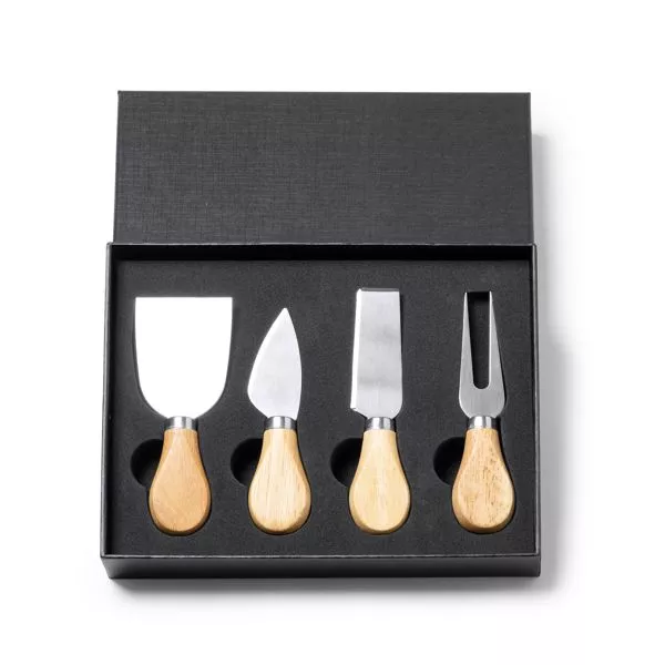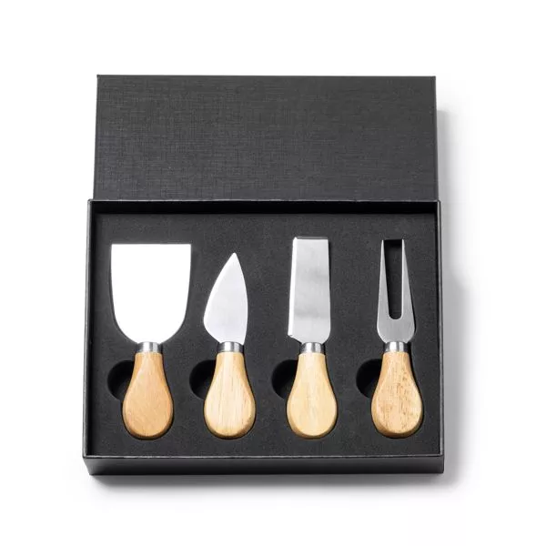 Набор для сыра с 4 приборами из нержавеющей стали с деревянной ручкой. Представлен в элегантном футляре с внутренней подкладкой.