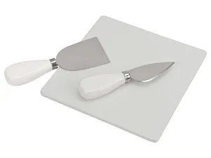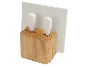 Набор для сыра Cheese Break предназначен для нарезки и подачи разных сортов сыра и любых других закусок. Ножи имеют белые керамические рукоятки, а доска полностью выполнена из керамики. Предметы устанавливаются в удобную деревянную подставку, в которой их можно хранить после использования. В комплект входит: - листовидный нож для твердых сортов сыра, - нож-лопатка для мягких сортов сыра, - керамическая доска для подачи закусок, - деревянная подставка для всех предметов. Гравировка (Без чернения) на данный товар осуществляется бесплатно. Оплачивается только настройка оборудования в размере 500 рублей на весь тираж.