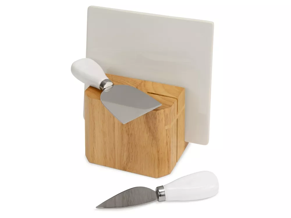 Набор для сыра Cheese Break предназначен для нарезки и подачи разных сортов сыра и любых других закусок. Ножи имеют белые керамические рукоятки, а доска полностью выполнена из керамики. Предметы устанавливаются в удобную деревянную подставку, в которой их можно хранить после использования. В комплект входит: - листовидный нож для твердых сортов сыра, - нож-лопатка для мягких сортов сыра, - керамическая доска для подачи закусок, - деревянная подставка для всех предметов. Гравировка (Без чернения) на данный товар осуществляется бесплатно. Оплачивается только настройка оборудования в размере 500 рублей на весь тираж.