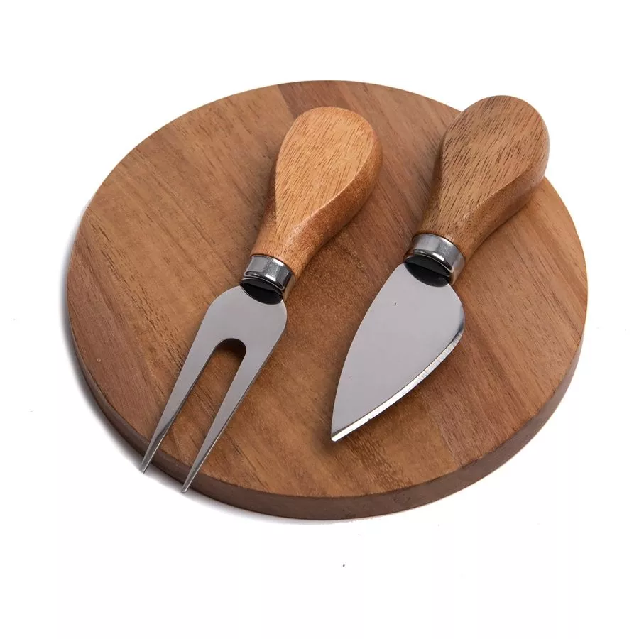 Набор для сыра: круглая доска и два инструмента в комплекте - nbsp;нож для твердого сыра и вилка.Лезвия ножей выполнены из высококачественной нержавеющей стали.Доска выполнена из экологически чистого и прочного материала — древесины акации. Она обладает высокой твердостью, водоотталкивающими свойствами и не впитывает запахи.Набор для сыра пригодится как для нарезки, так и для сервировки. nbsp; Индивидуальная упаковка - коробка из крафтового картона с ложементом