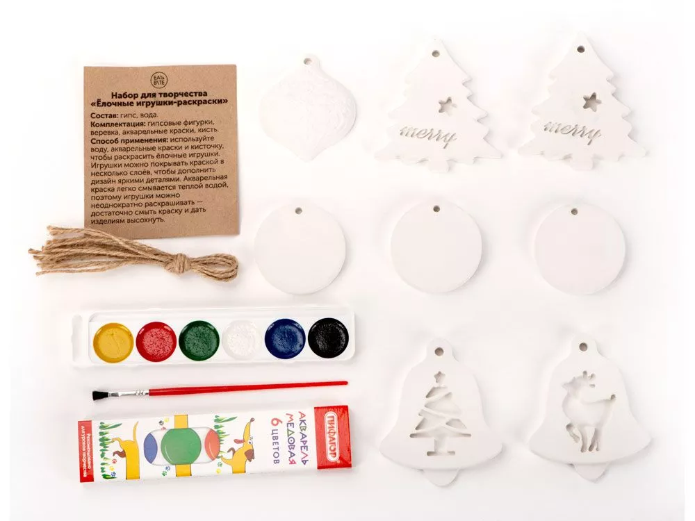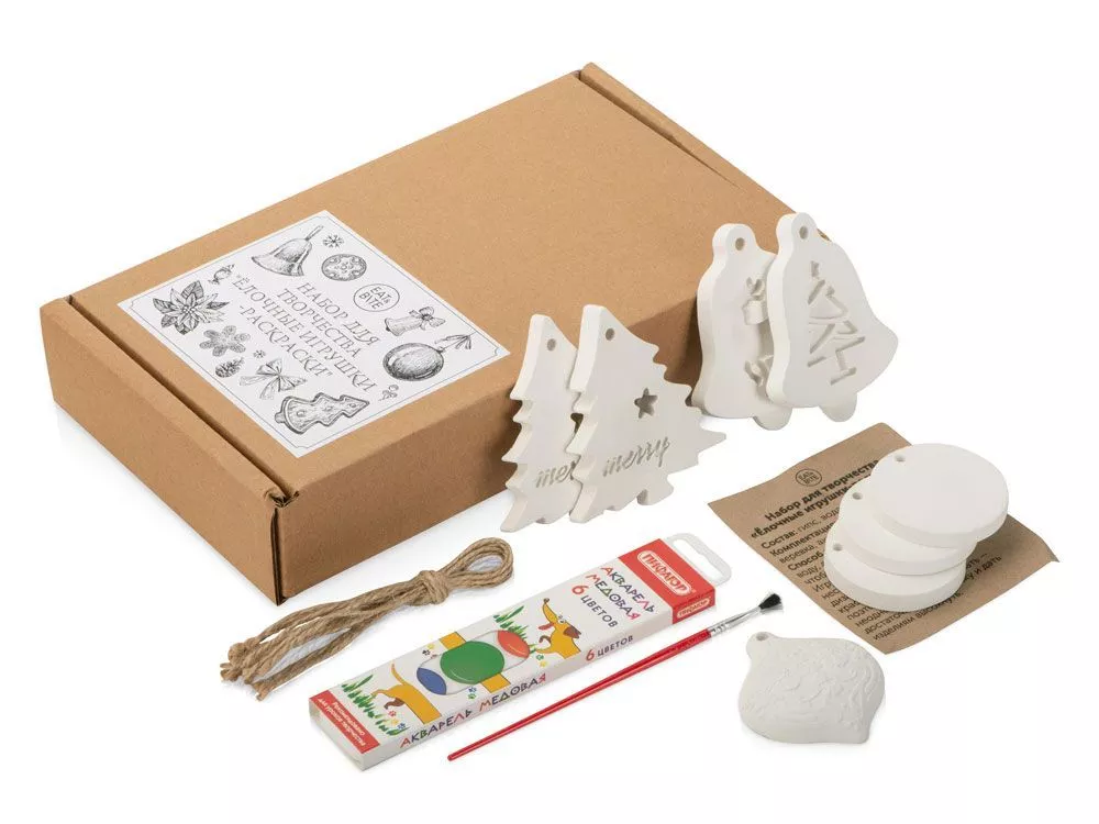 Создание уникальных новогодних игрушек своими руками — популярная и всеми любимая предновогодняя традиция, а также отличная возможность провести время с ребенком, не только весело, но и с пользой, а также стимулировать творческий потенциал юного творца. Мы подготовили готовый творческий набор, состоящий из игрушек, выполненных их гипса, кисти и акварельных красок. Способ применения: используйте воду, акварельные краски и кисточку, чтобы раскрасить ёлочные игрушки. Игрушки можно покрывать краской в несколько слоёв, чтобы дополнить дизайн яркими деталями. Акварельная краска легко смывается теплой водой, поэтому игрушки можно неоднократно раскрашивать — достаточно смыть краску и дать изделиям высохнуть. Цифровая печать (наклейка на белой пленке) на данный товар осуществляется бесплатно. Оплачивается только настройка оборудования в размере 950 рублей на весь тираж.