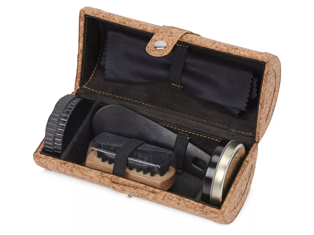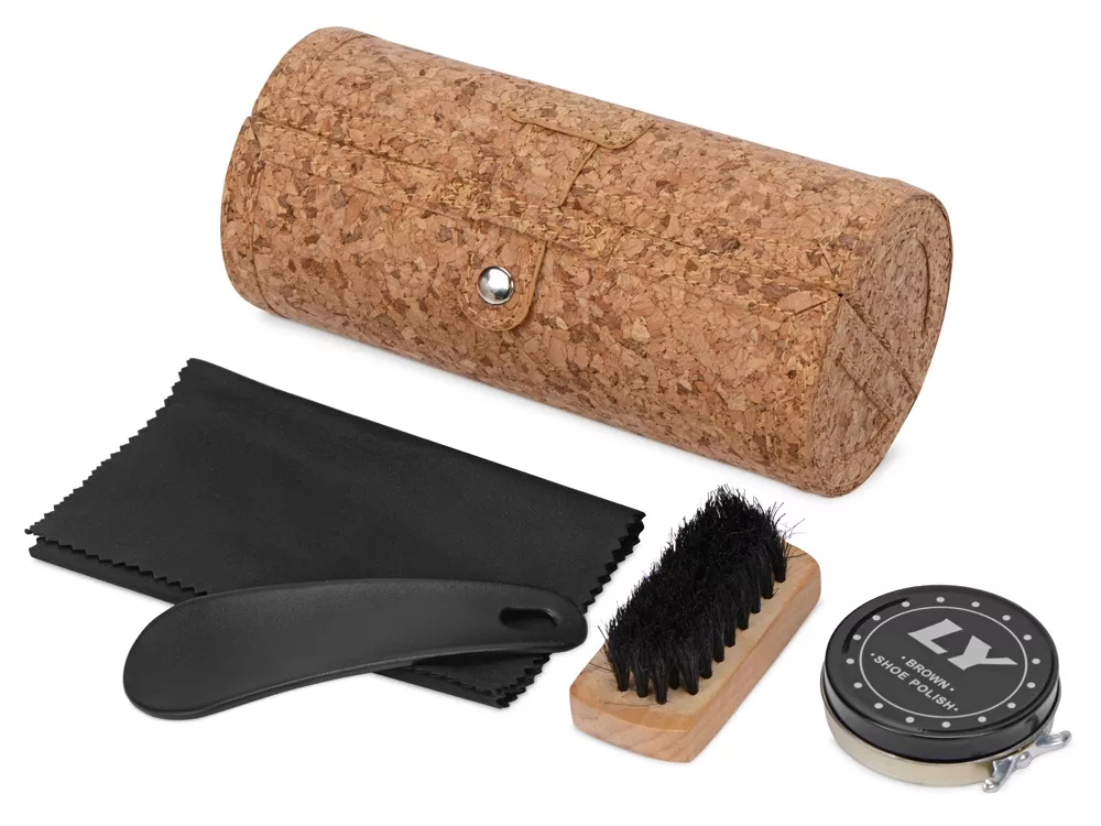 Набор для ухода за обувью из 5 предметов пригодиться в деловых поездках. Компактный чехол с пробковым покрытием надежно застегивается и займет совсем не много места.