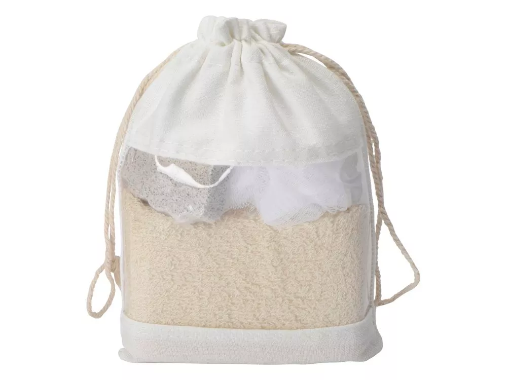 МатериалТовара:Сумка - полиэстер, хлопок с ПВХ, губка для ванны - полиэстер, мочалка - полиэтилен, пемза - известняк