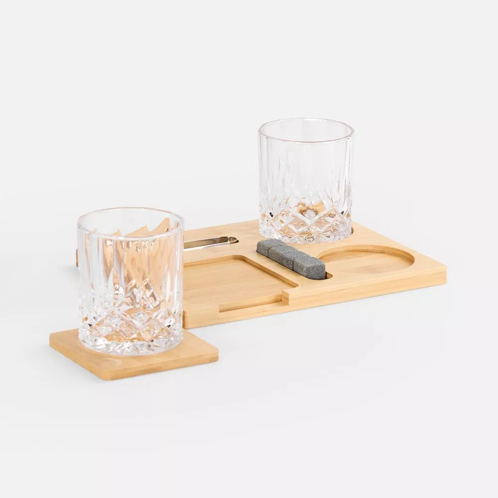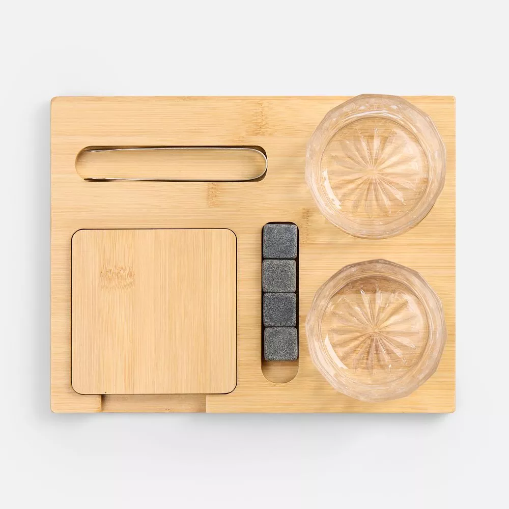 Полный арсенал для дегустации любимых сортов включает два элегантных стакана, костеры из натурального бамбука для безупречной подачи, камни для охлаждения без потери глубины вкуса и удобные щипцы для их использования.