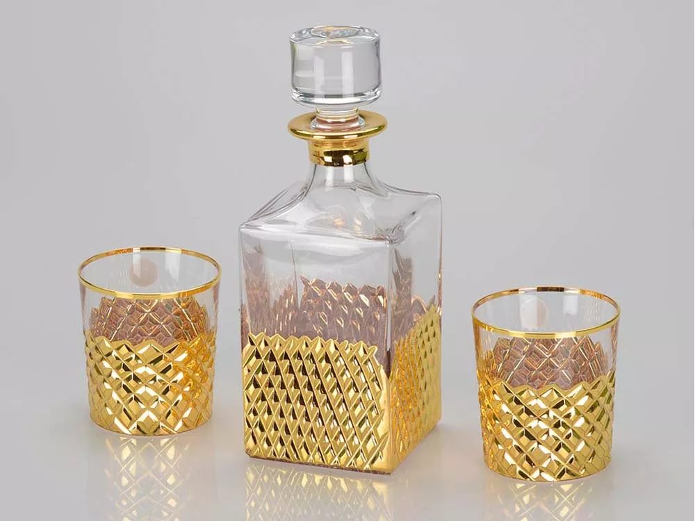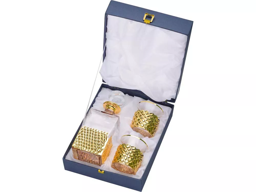 Стильный набор для виски из прозрачного хрусталя рассчитан на две персоны. Набор включает в себя графин, пару бокалов и футляр для хранения. Хрустальная поверхность графина и бокалов задекорирована интересным золотистым узором.