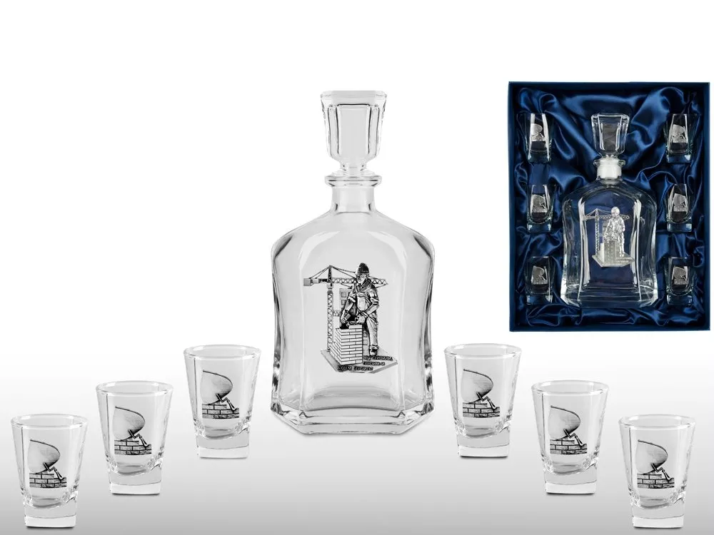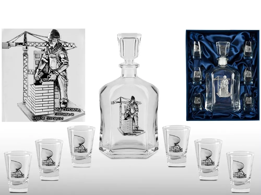 Отличная идея для подарка руководителям строительных фирм. Набор для водки включает в себя стеклянный штоф и 6 стопок задекорированных в строительной тематике. Набор аккуратно упакован в подарочный футляр.