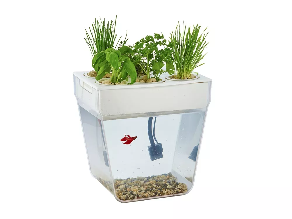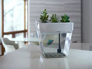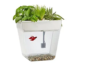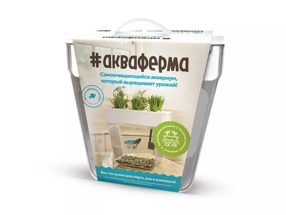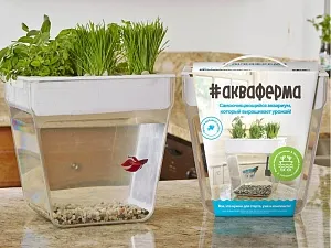 Акваферма представляет собой самоочищищающийся аквариум, который ещё и выращивает урожай. По сути — это замкнутая экосистема, поддерживающая баланс между растениями и рыбкой. Её отходы с помощью насоса поднимаются к горшочкам сверху и питают вашу маленькую плантацию. Взамен рыбка получает очищенную воду, а у любого городского жителя всегда есть в наличии свежая зелень к столу. Растения заботятся о чистоте аквариума, а сам аквариум заботится о рыбке и, конечно, о вашем здоровье. Ну а рыбку вам нужно будет выбрать самим и купить ее в ближайшем зоомагазине.
