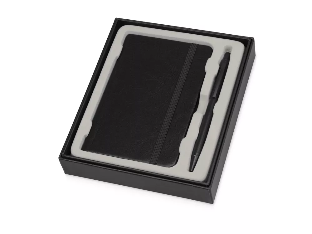 Набор для записей Альфа выдержан в строгом деловом стиле. В него входит линованный блокнот формата А6 с закладкой, эластичной застежкой и удобным карманом для карточек и записок, а также шариковая ручка в пластиковом корпусе с нажимным механизмом. Ручка и блокнот вложены в подарочную коробку. Набор Альфа отлично подойдет в качестве подарка к профессиональному празднику или сувенира на память о мероприятии.