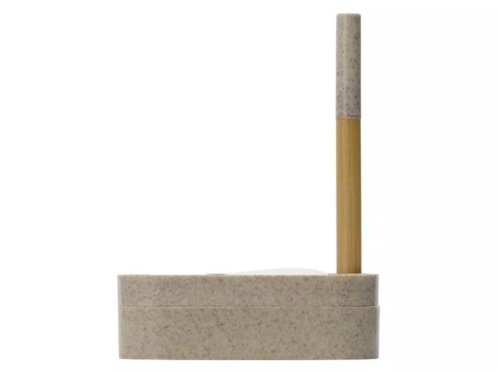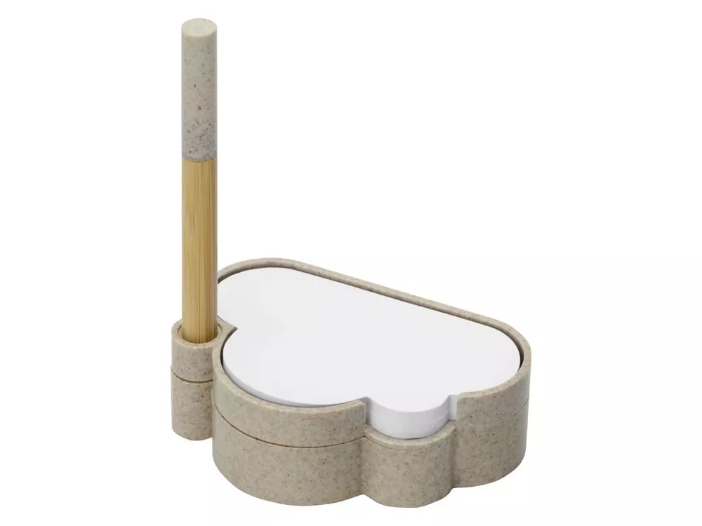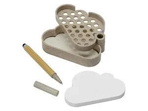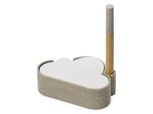 В набор для записей входят удобная подставка в форме облака из переработанной пшеницы, шариковая ручка-стилус из бамбука и переработанной пшеницы, бумага для записей и лист с семенами ромашки. Семена можно посадить как в самой подставке, так и в отдельном горшке. Также в наборе есть инструкция по выращиванию и уходу за ромашкой. Гравировка (CO2 лазер) (Без чернения) на данный товар осуществляется бесплатно. Оплачивается только настройка оборудования в размере 950 рублей на весь тираж.