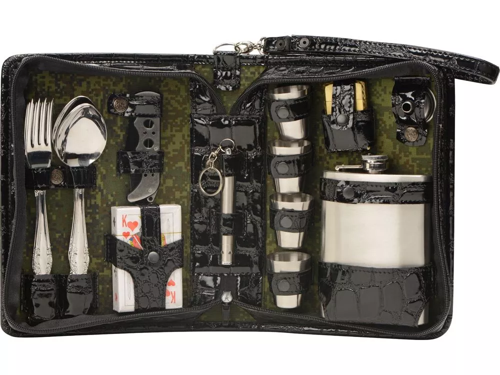 Оригинальный дорожный набор на 4 персоны в барсетке с удобным ремешком для переноски. В набор входит: - фляжка 240 мл- 1 шт - стопка 30 мл- 4 шт - ложка столовая- 4 шт - вилка столовая- 4 шт - воронка- 1 шт - нож- 1шт - зажигалка- 1шт - фонарик- 1 шт (батарейка AAA в комплекте) - карты игральные- 1 шт