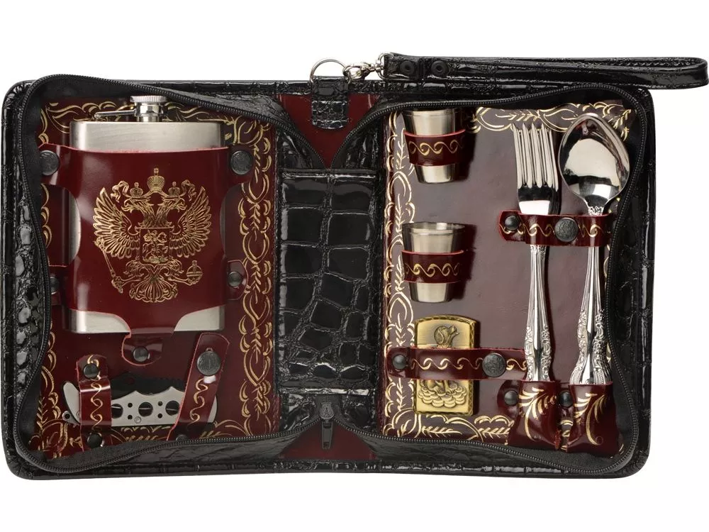 Оригинальный дорожный набор на 4 персоны в барсетке с удобным ремешком для переноски. Барсетка из искусственной кожи, отделка- натуральная кожа с художественным выжиганием. В набор входит: - фляжка 240 мл- 1 шт - стопка 30 мл- 4 шт - ложка столовая- 4 шт - вилка столовая- 4 шт - нож- 1шт - зажигалка- 1шт