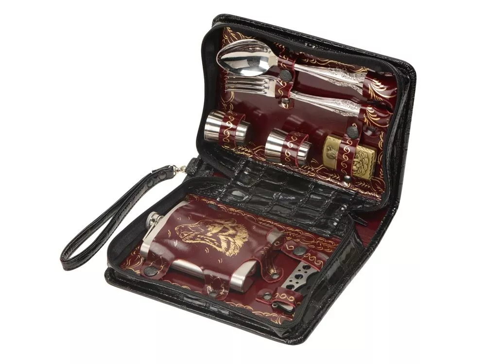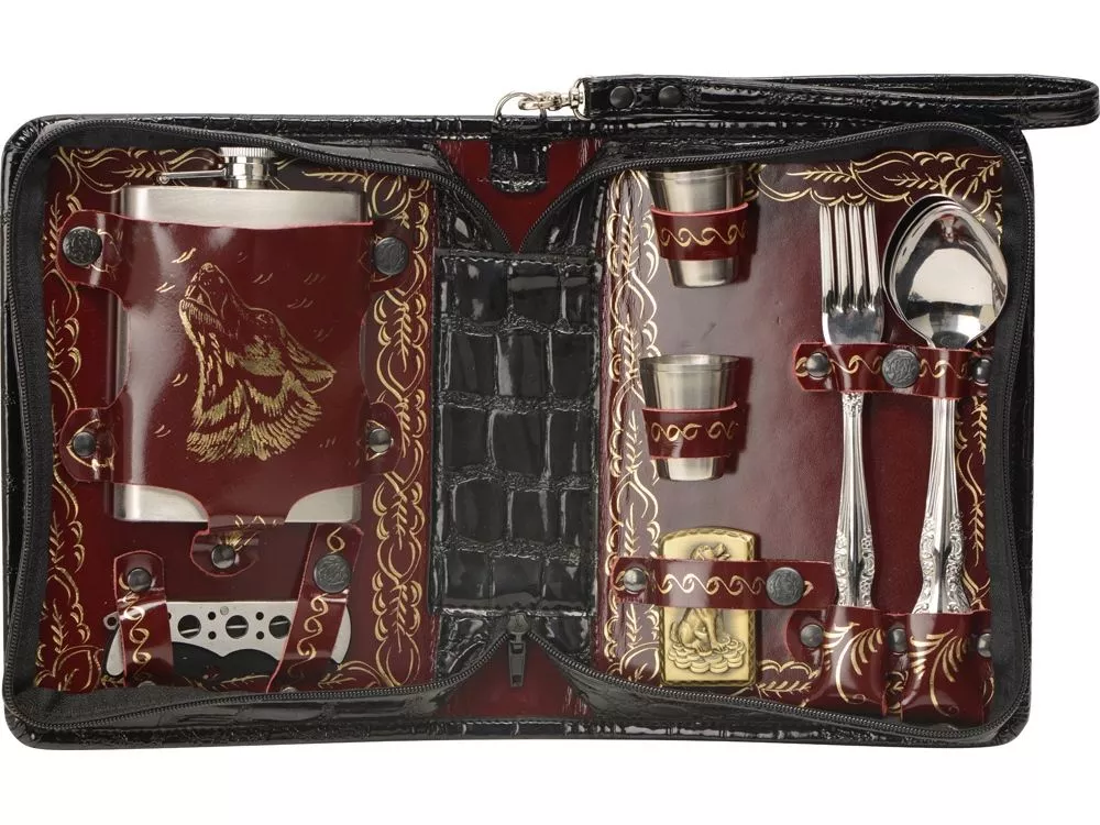 Оригинальный дорожный набор на 4 персоны в барсетке с удобным ремешком для переноски. Барсетка из искусственной кожи, отделка- натуральная кожа с художественным выжиганием. В набор входит: - фляжка 240 мл- 1 шт - стопка 30 мл- 4 шт - ложка столовая- 4 шт - вилка столовая- 4 шт - нож- 1шт - зажигалка- 1шт