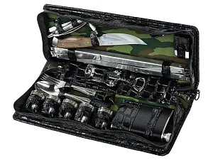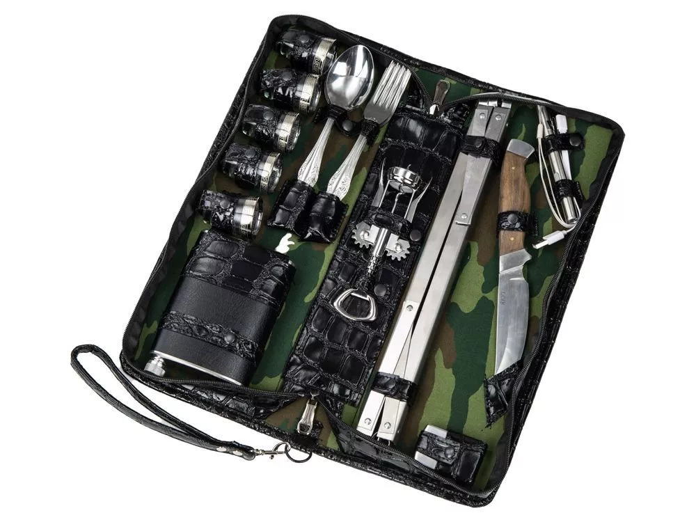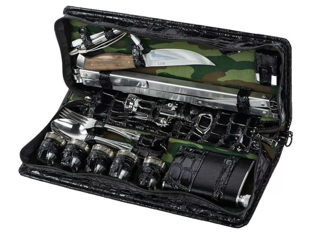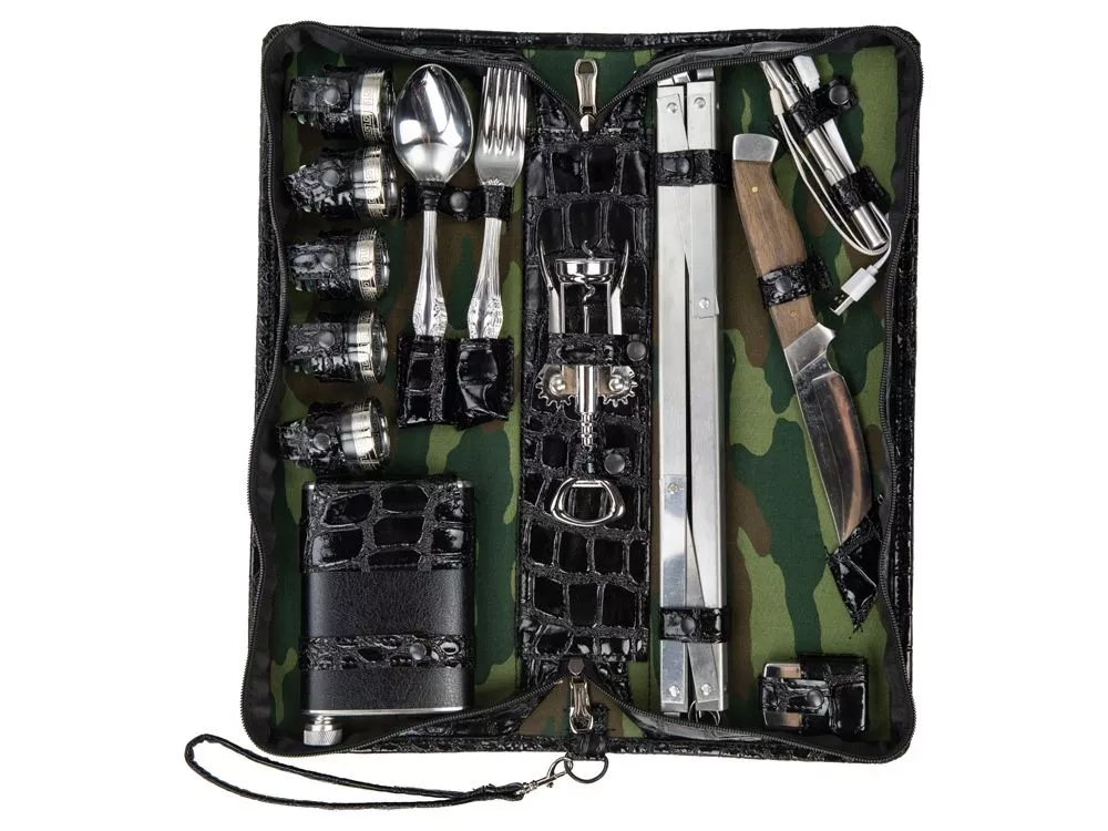 Оригинальный дорожный набор на 5 персон в барсетке с удобным ремешком для переноски. В набор входит: - фляжка 240 мл- 1 шт - стопка 30 мл- 5 шт - ложка столовая- 5 шт - вилка столовая- 5 шт - нож- 1шт - штопор- 1 шт - мангал- 1 шт - шампур- 6 щт - зажигалка- 1шт - фонарик- 1 шт - кабель micro-USB- 1шт