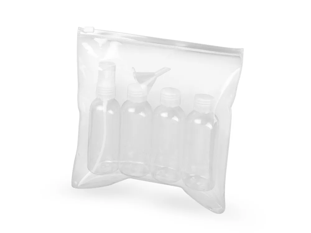 Собирая чемодан, мы всегда стремимся уменьшить вес и объем дорожной сумки. Дорожный набор Tokyo в этом деле первый помощник. В набор входят три бутылки, объемом в 80 мл., 1 бутылка-спрей и мини-воронка. В эти бутылочки легко перелить необходимые косметические средства, чтобы не тащить с собой целый флакон. Упакован в прозрачную пластиковую косметичку на молнии.