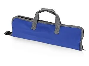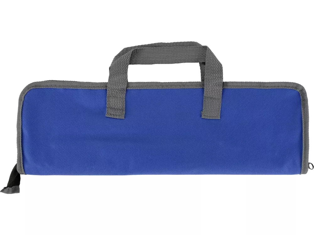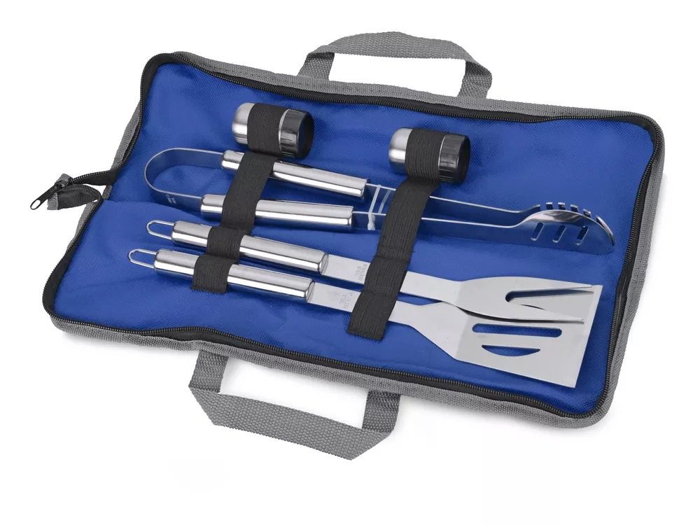 Набор включает в себя вилку, лопатку, щипцы, солонку и перечницу. Удобный чехол на замке-молнии позволяет компактно хранить составляющие набора. На чехол можно нанести изображение или надпись.