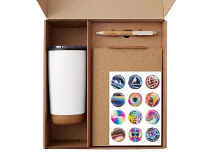 Набор Earthly— стильный и экологичный подарок, который сочетает практичность и заботу о природе. Такой набор отлично подойдёт сотрудникам, клиентам и партнёрам, которые ценят экологичность и практичность. Блокнот выполнен из пробки - натурального и быстровозобнавляемого материала для записи экологичных идей, заметок и планов на день; Ручка из пробки и переработанной пшеницы, которая всегда под рукой; Термокружка с двойными стенками дополнена непротекаемой прозрачной пластиковой крышкой-слайдером, которая позволяет дополнительно защитить напиток от остывания. Пробковое основание обеспечивает кружке мягкую и бесшумную посадку. Костеры из пробки подойдут для самой разной посуды: большой диаметр и универсальная форма делают его совместимым с бокалами, стаканами и кружками различных объемов. В набор входит 4 костера, упакованных в хлопковый мешочек на шнурке. И подставки, и упаковка набора выполнены из натуральных материалов; Набор стикеров — для ярких акцентов и персонализации вещей. Универсальный ложемент обеспечивает аккуратное размещение и надёжную фиксацию элементов, делая набор эффектным и презентабельным при вручении. Дополнительное преимущество — набор доступен в конструкторе наборов: компоненты можно заменить и собрать индивидуальный вариант под стиль компании или вкусы получателя.