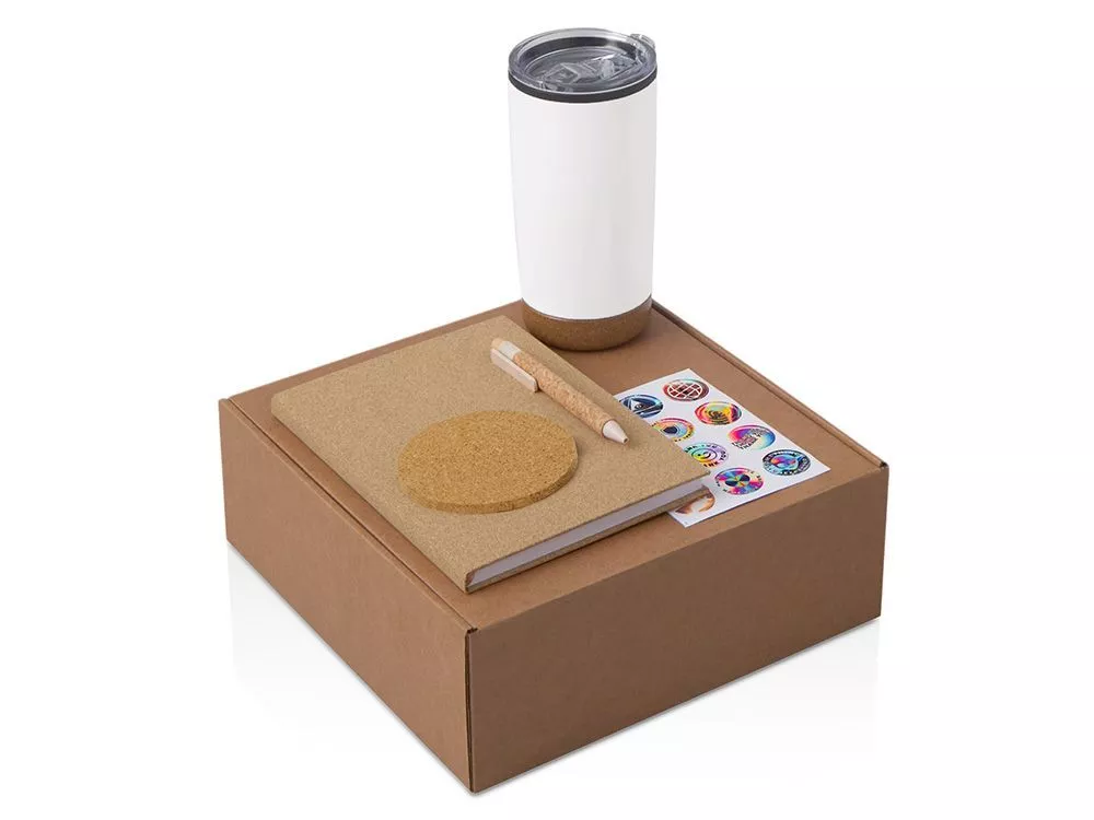 Набор Earthly— стильный и экологичный подарок, который сочетает практичность и заботу о природе. Такой набор отлично подойдёт сотрудникам, клиентам и партнёрам, которые ценят экологичность и практичность. Блокнот выполнен из пробки - натурального и быстровозобнавляемого материала для записи экологичных идей, заметок и планов на день; Ручка из пробки и переработанной пшеницы, которая всегда под рукой; Термокружка с двойными стенками дополнена непротекаемой прозрачной пластиковой крышкой-слайдером, которая позволяет дополнительно защитить напиток от остывания. Пробковое основание обеспечивает кружке мягкую и бесшумную посадку. Костеры из пробки подойдут для самой разной посуды: большой диаметр и универсальная форма делают его совместимым с бокалами, стаканами и кружками различных объемов. В набор входит 4 костера, упакованных в хлопковый мешочек на шнурке. И подставки, и упаковка набора выполнены из натуральных материалов; Набор стикеров — для ярких акцентов и персонализации вещей. Универсальный ложемент обеспечивает аккуратное размещение и надёжную фиксацию элементов, делая набор эффектным и презентабельным при вручении. Дополнительное преимущество — набор доступен в конструкторе наборов: компоненты можно заменить и собрать индивидуальный вариант под стиль компании или вкусы получателя.