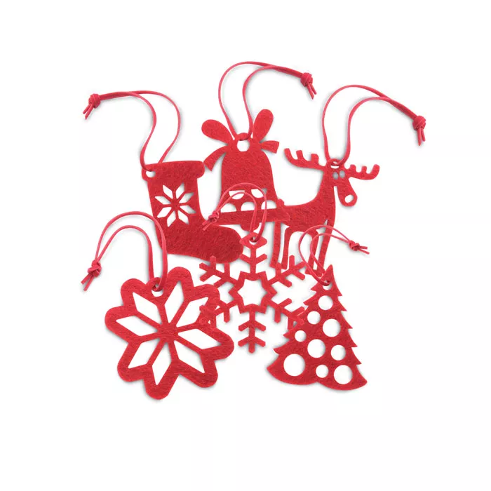 Набор из 6 фетровых новогодних подвесок: елочка, снежинка, сапожок, колокольчик, цветок и олень.