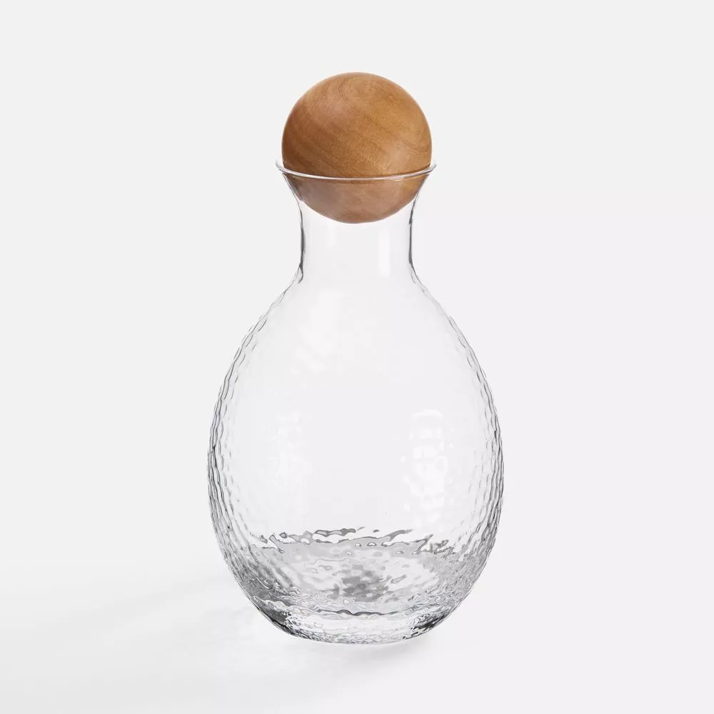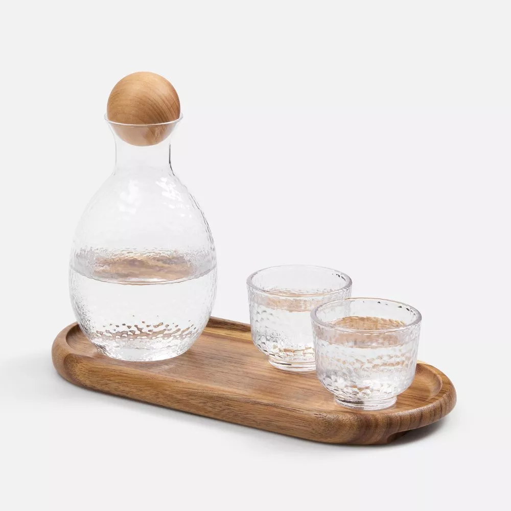 Этот набор для крепких напитков — как маленький арт-объект. Текстурированное стекло графина и стопок создает живую игру бликов и отсветов, а натуральное дерево подноса и пробки добавляет теплый природный акцент.