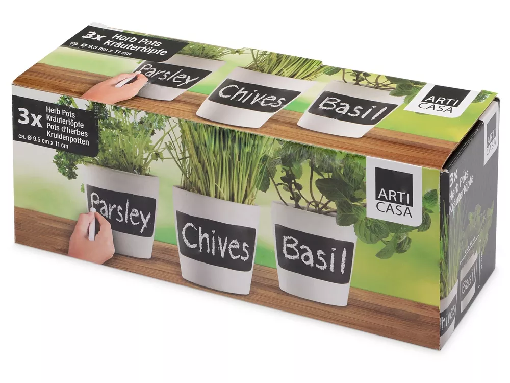 Набор состоит из трех стильных и простых керамических горшочков для растений. Они не занимают много места и будут отлично смотреться как в классическом домашнем интерьере, так и в современном офисном лофте. Все растения можно подписать - на каждом горшке есть табличка с покрытием для рисования мелом. Мел в комплект не входит.