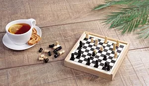Игровое поле для шахмат и шашек нанесено прямо на выдвижную крышку футляра, обратная сторона остается чистой.