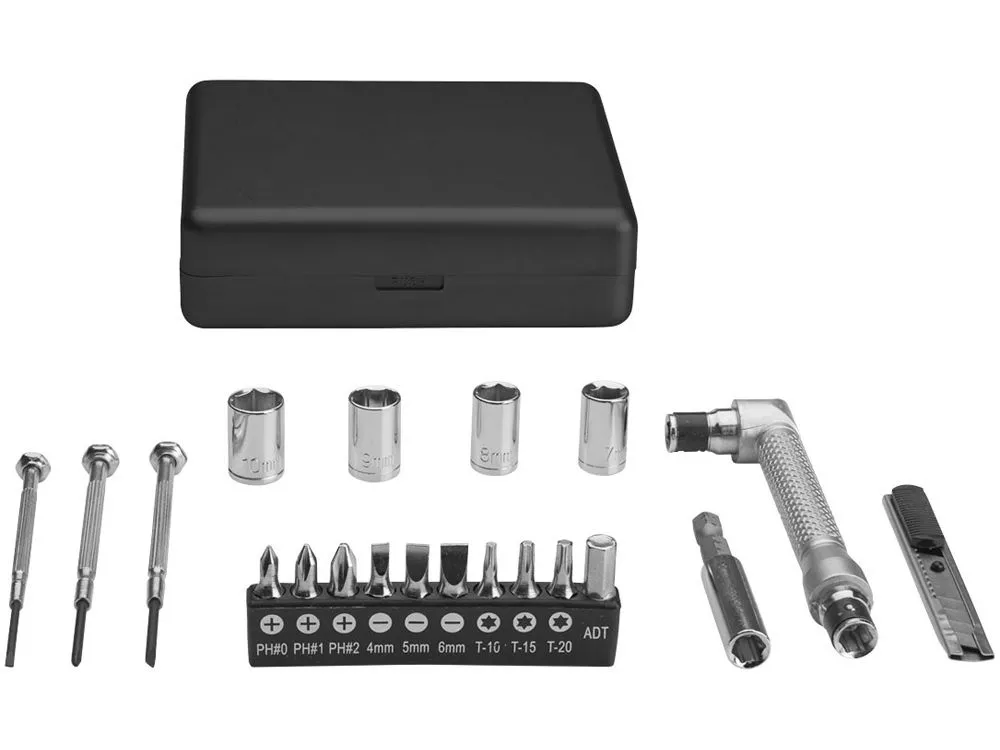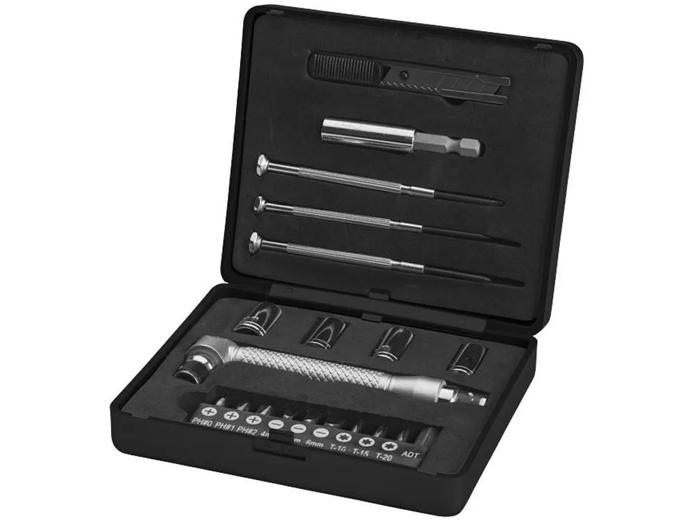 Набор из 20 инструментов в маленькой коробочке. В комплекте три отвертки, 10 насадок в холдере: три размера Philips (PH0, PH1, PH2) три плоских (4,5,6 мм), три звездочкой (Т10, Т15, Т20) и 1 адаптер; четыре ключа ( 7, 8, 9, 10 мм), один ножик, ручка и коннектор. Упакован в коробку STAC. АБС пластик. Тампопечать (1 цвет (цветные изделия)) на данный товар осуществляется бесплатно. Оплачивается только настройка оборудования в размере 4000 рублей на весь тираж.