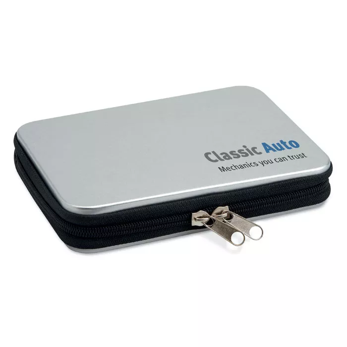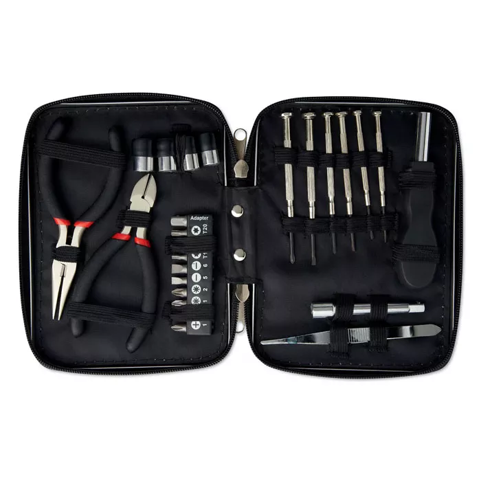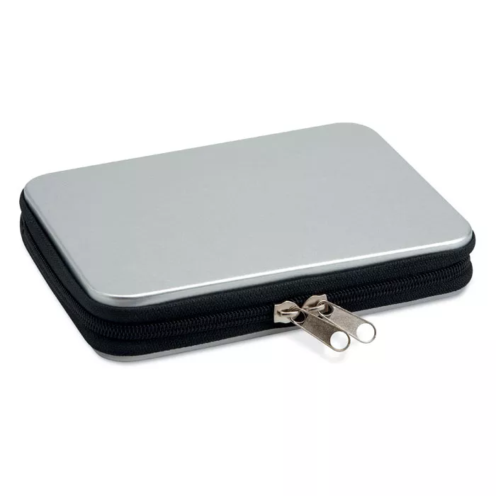 Набор инструментов в алюминиевом футляре с молнией, состоит из круглогубцев, кусачек, отвертки со сменными насадками, пинцета и 6 часовых отверток .