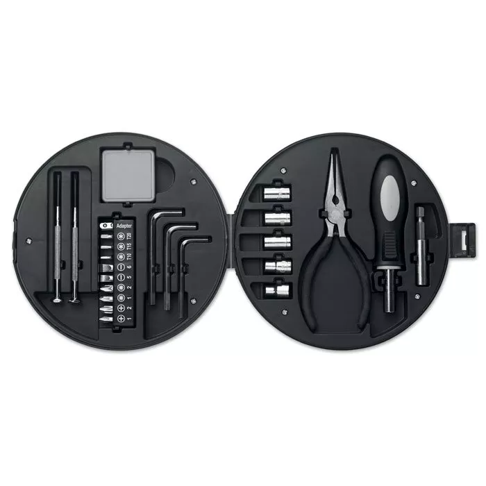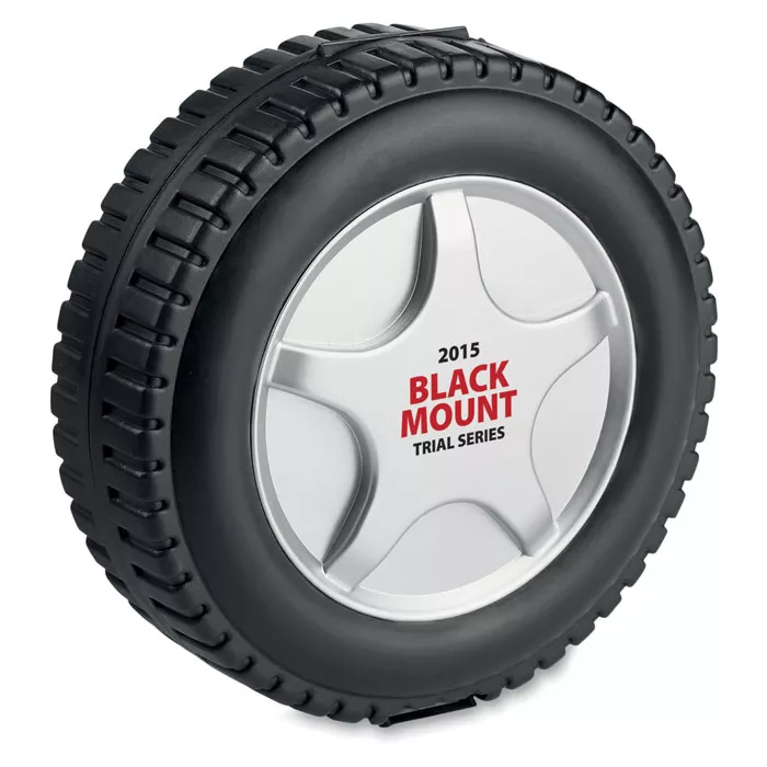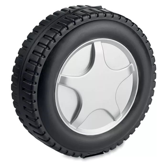 Набор 25 инструментов в виде автомобильной шины: отвертки, ключи, рулетка, пассатижи.