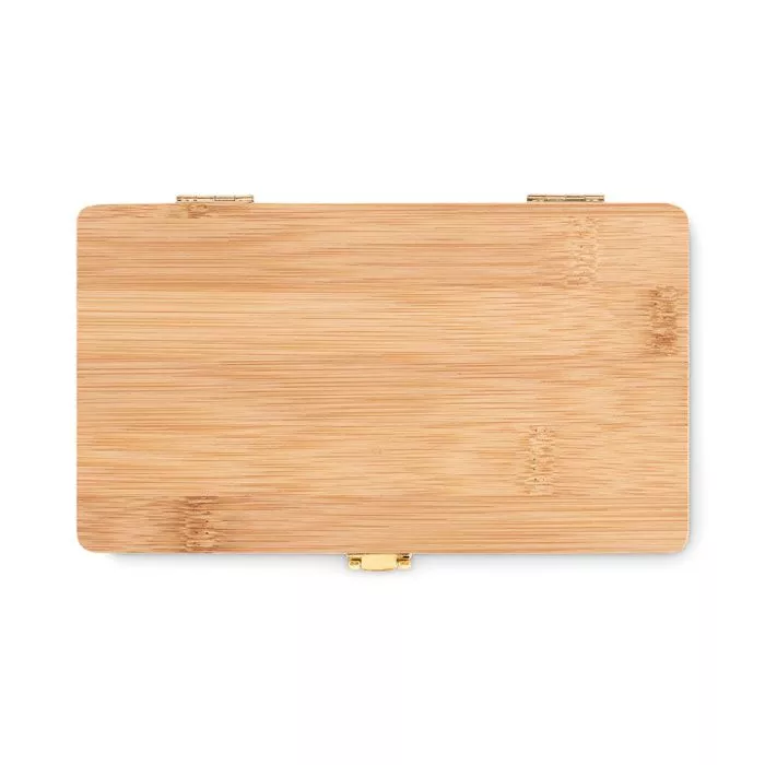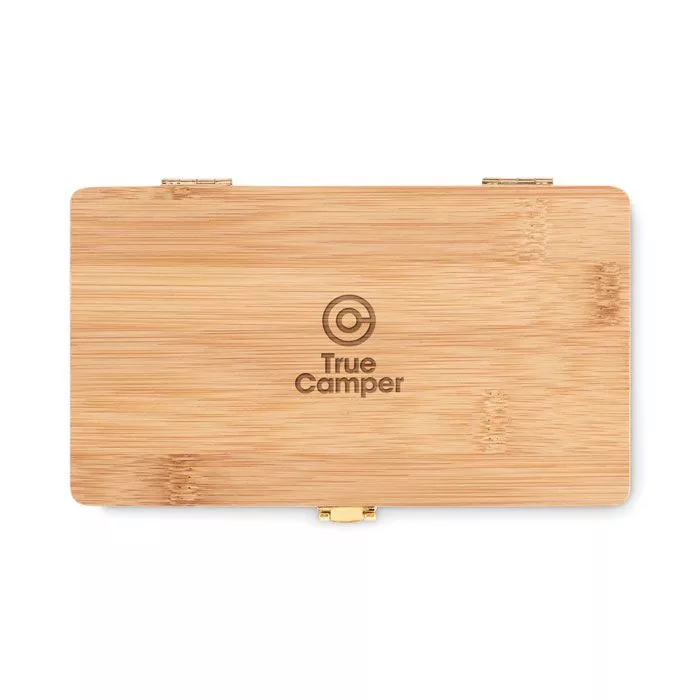 Набор инструментов в бамбуковом футляре: 3 отвертки, 10 сверел, 3 шлицевых и 3 звездообразных насадки, 1 переходник, 4 торцевых головки, 1 кусачки, 1 рукоятка и 1 соединитель.