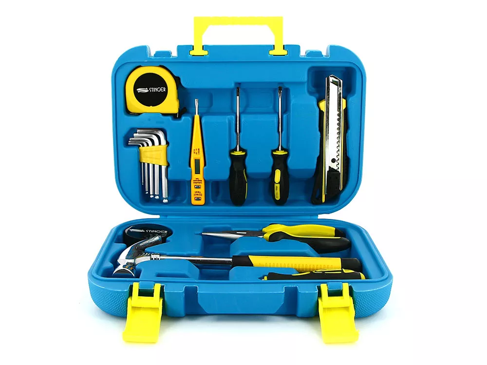 НАБОР ИНСТРУМЕНТОВ STINGER, 15 ПРЕДМЕТОВ Набор инструментов STINGER NST028016 на 15 предметов – идеальный подарок для мужчины. В компактном пластиковом кейсе поместилось всё, что может потребоваться в быту. Все компоненты выполнены из высококачественной закаленной углеродистой стали с хромированным покрытием. Эргономичная пластиковая ручка обеспечивает устойчивое положение в руке. Кейс размером 290 х 75 x 205 мм не занимает много места. Его можно разместить на полке, в шкафу, в машине или гараже. В КОМПЛЕКТЕ: 1. Нож канцелярский - 1 шт. 2. Отвёртка шлицевая - 2 шт. 3. Отвёртка крестовая - 2 шт. 4. Ключ шестигранный – 5 шт. 5. Молоток (0,25 кг) - 1 шт. 6. Отвёртка индикаторная – 1 шт. 7. Рулетка измерительная (1 м) - 1 шт. 8. Лента изоляционная - 1 шт. 9. Плоскогубцы - 1 шт. ХАРАКТЕРИСТИКИ: Материал: углеродистая сталь, пластик, полипропилен Размер: 290 х 205 х 75 мм