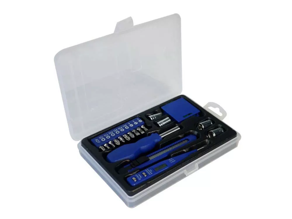 НАБОР ИНСТРУМЕНТОВ STINGER, 18 ПРЕДМЕТОВ Набор инструментов на 18 предметов STINGER W0504 представляет собой оптимальное сочетание функциональности и качества. В компактном белом кейсе найдется всё для проведения мелкого бытового ремонта. Все предметы изготовлены из высококачественной закаленной углеродистой стали с хромированным покрытием, а рукоятки - из углепластика, обеспечивающего удобное положение инструмента в руке. В КОМПЛЕКТЕ: 1. Рукоятка для бит - 1 шт. 2. Бита - 9 шт. 3. Адаптер для шестигранных головок – 1 шт. 4. Головка шестигранная – 4 шт. (7/8/9/10 мм) 5. Рулетка измерительная (1 м) с уровнем – 1 шт. 6. Нож канцелярский - 1 шт. 7. Отвёртка индикаторная – 1 шт. ХАРАКТЕРИСТИКИ: Материал: углеродистая сталь, углепластик (карбон) Размер: 215 х 130 х 30 мм