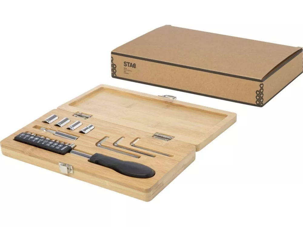 Ощутите идеальное сочетание экологичности и функциональности с набором инструментов Rivet. Этот тщательно разработанный набор инструментов не только привлекателен визуально, но и экологически безопасен без ущерба для качества и производительности. Природная прочность и долговечность бамбука гарантируют защиту ваших инструментов на долгие годы. Внутри кейса вы найдете набор из 19 необходимых инструментов, изготовленных из углеродистой стали и переработанной пластмассы: 1 длинная шарнирная ручка, 4 высококачественные насадки для различных целей, 1 удлинитель для труднодоступных мест, 10 прецизионных бит отверток для любых задач и 3 шестигранных ключа для сборки мебели. Независимо от того, являетесь ли вы любителем делать что-то своими руками или профессиональным мастером, эти инструменты рассчитаны на надежную работу и выдерживают суровые условия эксплуатации. Поскольку бамбук — природный материал, цвет и размер сырья могут быть разными, что, в свою очередь, может повлиять на итоговый вид печати. Упаковано в подарочную коробку STAC из экологически чистых источников. Carbon steel, Recycled PP Plastic.