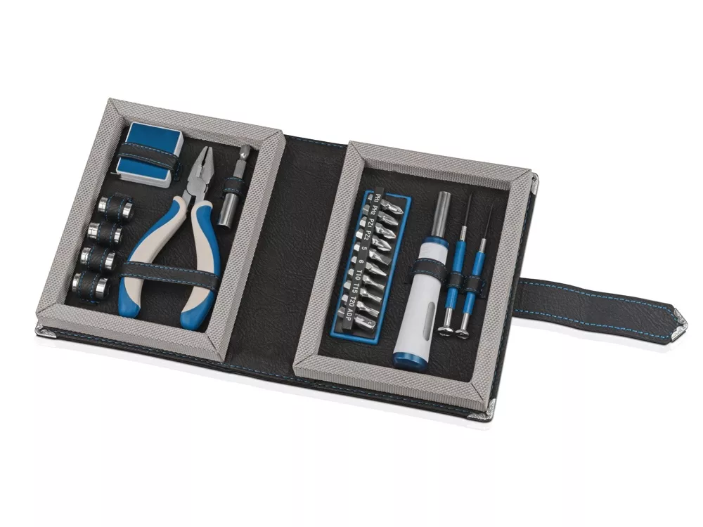 Полезный набор инструментов, состоящий из 20 предметов, компактно размещается в футляре из кожзаменителя в виде книги. Набор можно возить в машине, брать с собой на дачу, ведь он не займет много места.