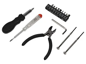 Набор инструментов в футляре в виде канистры включает в себя 1 тестер напряжения, 1 пару плоскогубцев, 1 шестигранный ключ, 1 рукоятку, к которой можно крепить отвертки, 2 прецизионные отвертки, 1 крестообразную головку, 1 плоскую головку, 10 бит. Тампопечать (1 цвет (цветные изделия)) на данный товар осуществляется бесплатно. Оплачивается только настройка оборудования в размере 3000 рублей на весь тираж.