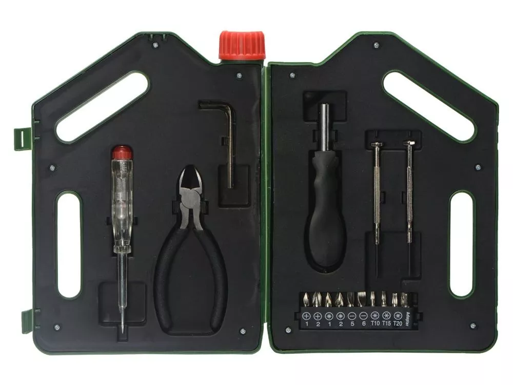Набор инструментов в футляре в виде канистры включает в себя 1 тестер напряжения, 1 пару плоскогубцев, 1 шестигранный ключ, 1 рукоятку, к которой можно крепить отвертки, 2 прецизионные отвертки, 1 крестообразную головку, 1 плоскую головку, 10 бит. Тампопечать (1 цвет (цветные изделия)) на данный товар осуществляется бесплатно. Оплачивается только настройка оборудования в размере 3000 рублей на весь тираж.