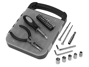 Набор инструментов в удобном пластиковом кейсе, состоит из 6 инструментов и 16 насадок: - Плоскогубцы - Отвертка с удлиннителем - 2 шестигранника - 2 тонких отвертки - 6 головок гаечных торцевых ключей (6/7/8/9/10 мм) - 9 бит + адаптер