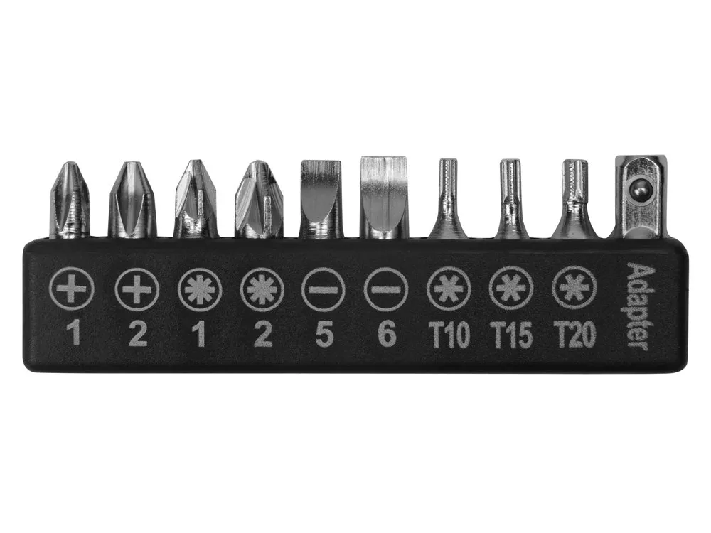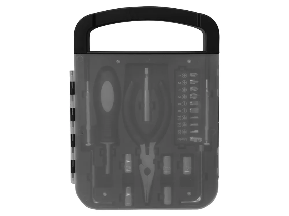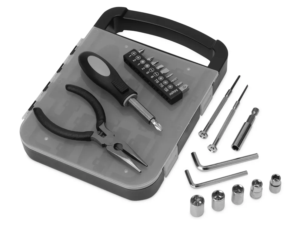 Набор инструментов в удобном пластиковом кейсе, состоит из 6 инструментов и 16 насадок: - Плоскогубцы - Отвертка с удлиннителем - 2 шестигранника - 2 тонких отвертки - 6 головок гаечных торцевых ключей (6/7/8/9/10 мм) - 9 бит + адаптер